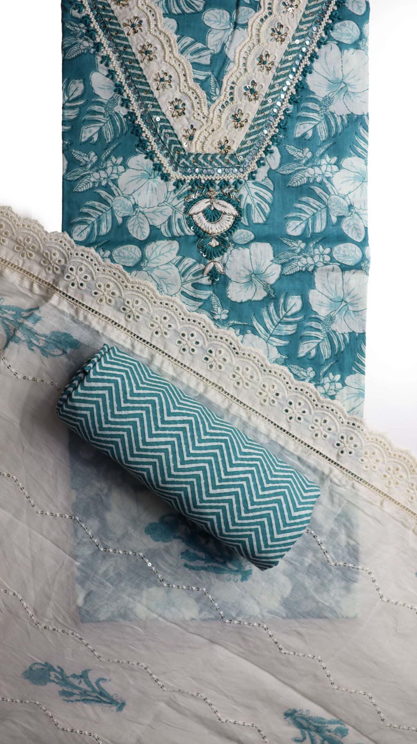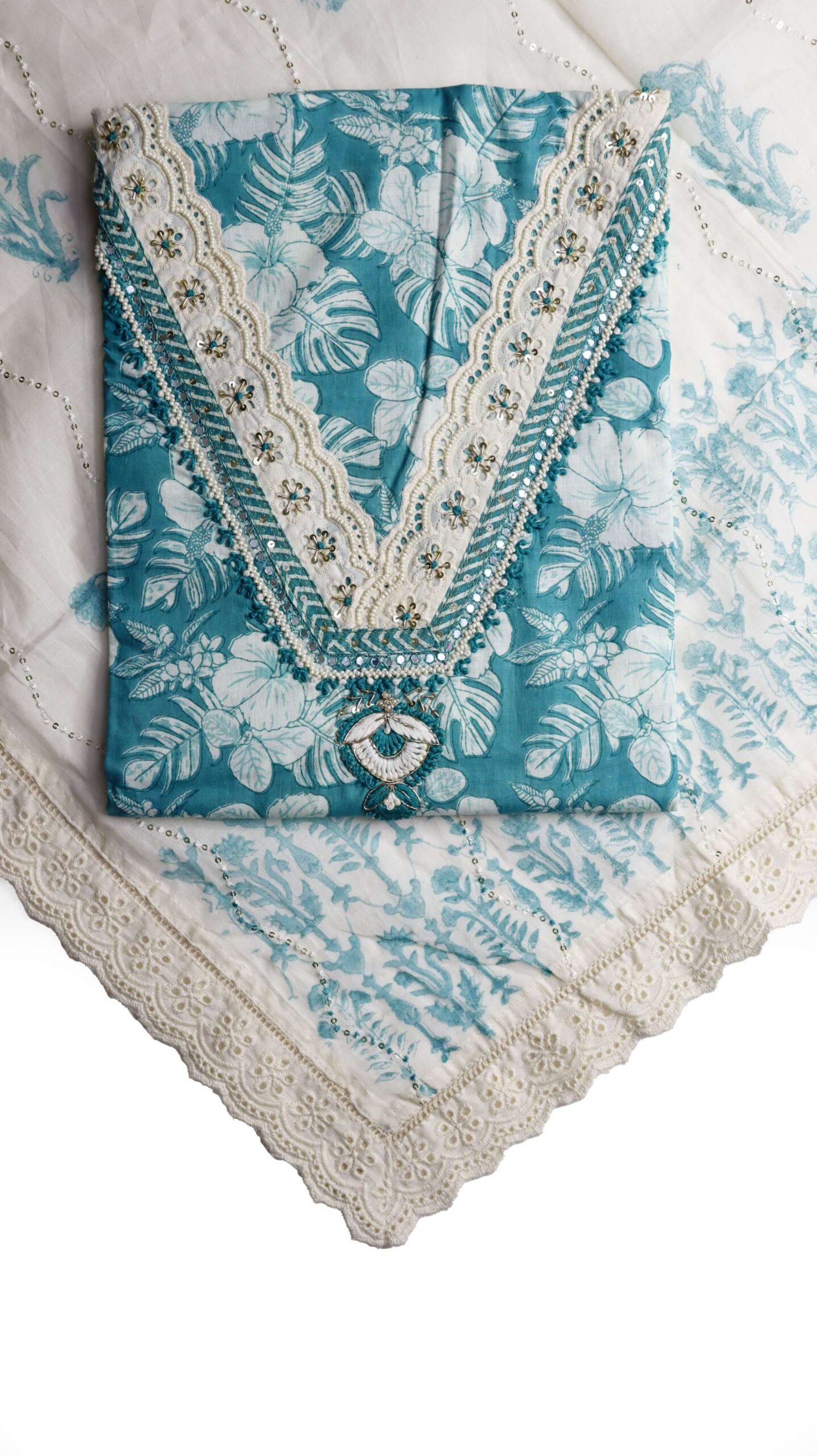 DETAILS : COTTON KURTA WITH PERAL AND SEQUENCE WORK ON NECKLINE