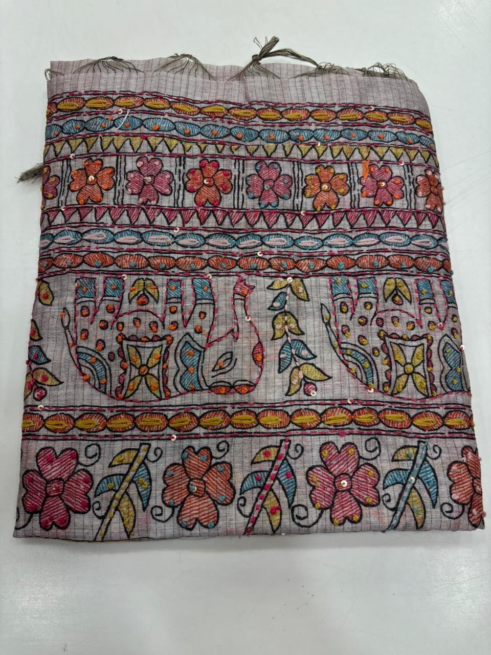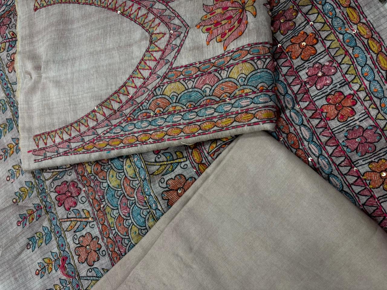DETAILS : CHANDERI SILK SUIT WITH HAND PRINTED KATH WORK AND MADHUBANI KATHA PRINT DUPATTA